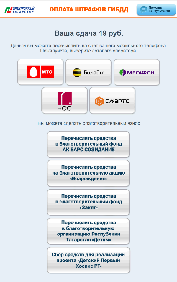 Сдачу, полученную при оплате государственных услуг или пошлин через инфоматы, можно внести не только на счет мобильного телефона любого оператора связи республики, но и на счет благотворительных фондов. Пользователи могут направить средства в благотворительные фонды: «Ак барс Созидание», «Возрождение», «Закят», «Детям», а также в проект «Детский Первый хоспис РТ».