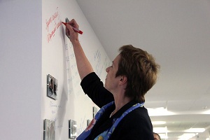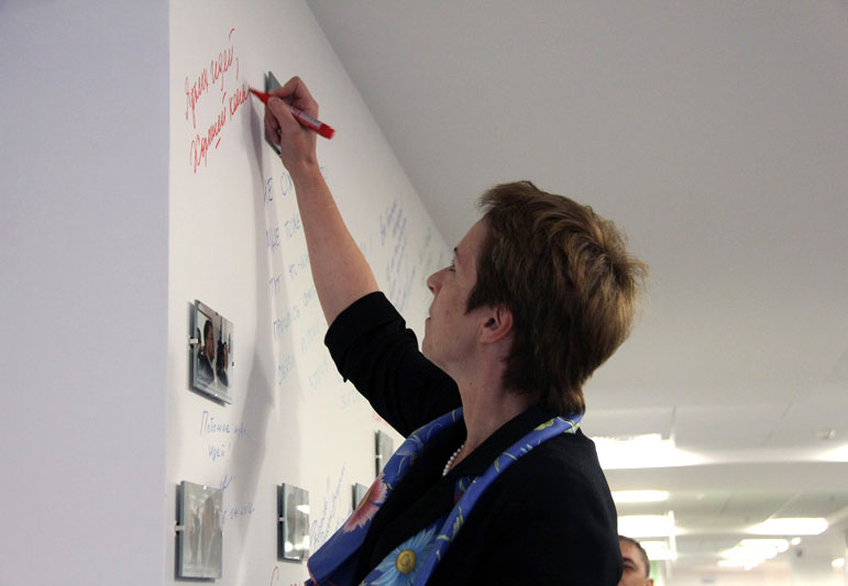 Ольга Дергунова оставила пожелание резидентам Бизнес-инкубатора на «стене славы»: «Ярких идей, хорошей команды, быстрой монетизации на благо России».