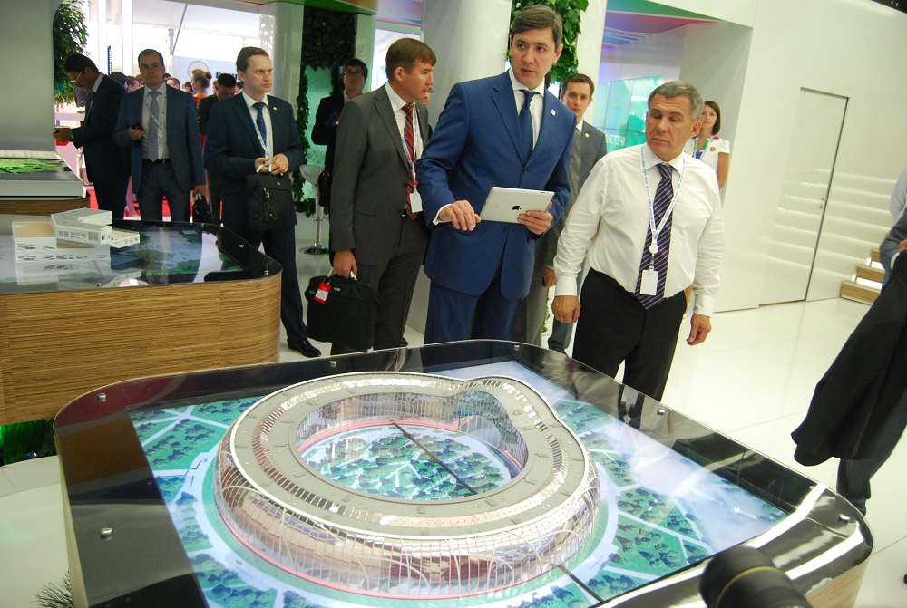 Стенд Республики Татарстан частично состоит из фитостен и декорирован двумя водопадами, что символизирует экологичность и близость проекта к природе. На стенде представлены макет кампуса будущего IT-университета, а также жилого дома Иннополиса.
