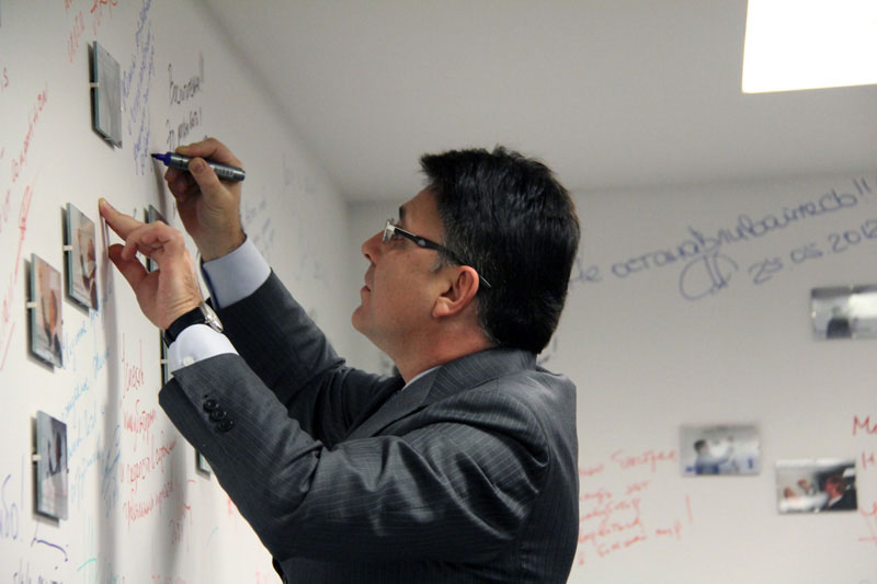 В Бизнес-инкубаторе делегации презентовали систему распознавания речи RealSpeaker. Разработчики данной системы создали сверхточный пользовательский аудио-визуальный распознаватель речи, который не только определяет голосовые команды, но и распознает их, считывая информацию по движению губ. Протестировав программу, Александр Жаров пожелал ребятам удачи и расписался на «стене славы»: «Желаю хозяевам и стараперам успешного upgrade во всем».