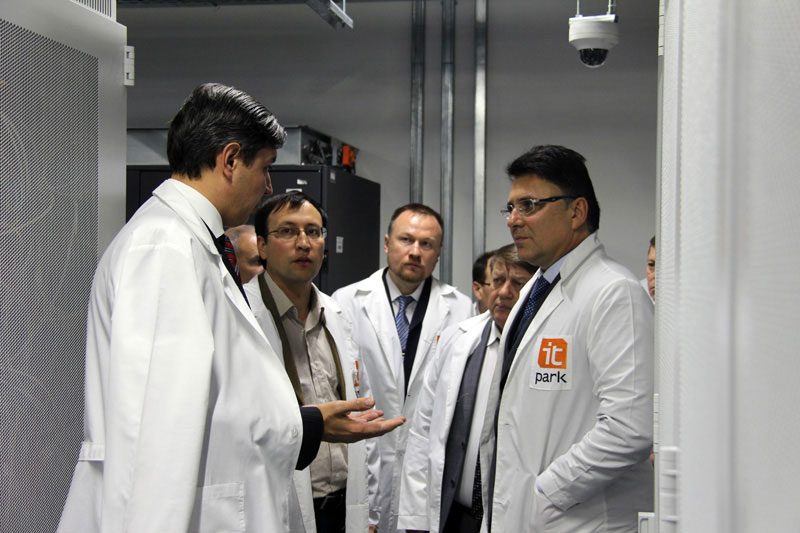 Далее делегация посетила Центр обработки данных – Дата-центр ИТ-парка. Дата-центр делится на два ЦОДа: коммерческий и государственный. Общая площадь ЦОДов – 1000 кв.м. По энерго-отказоустойчивости Дата-центр соответствует международным стандартам Tier 3.