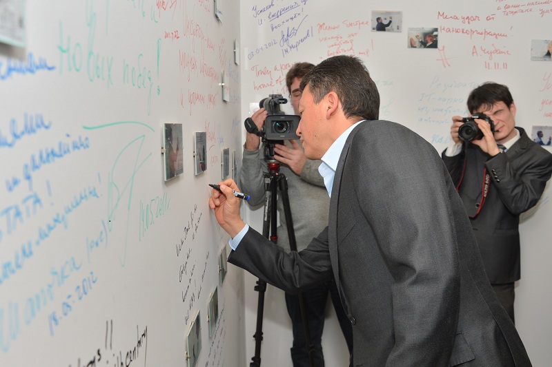 На память о посещении Бизнес-инкубатора Тимур Кулибаев оставил надпись на стене: «Новых побед и новых бизнес-идей».