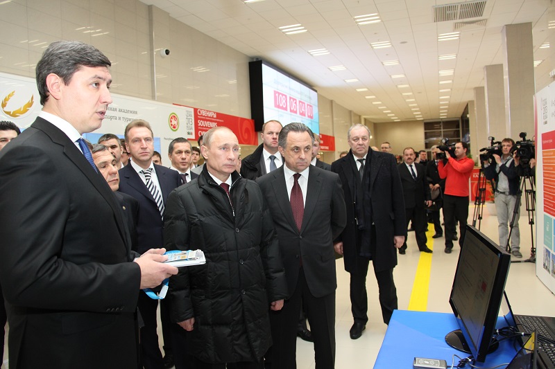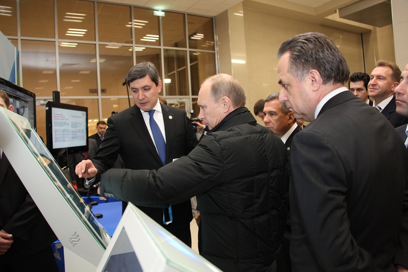 Далее Владимир Путин и сопровождавший его Президент РТ Рустам Минниханов осмотрели стенд, на котором была представлена информация об информационной и телекоммуникационной инфраструктуре Всемирных студенческих игр. Министр связи и массовых коммуникаций РФ Николай Никифоров и министр информатизации и связи РТ Роман Шайхутдинов рассказали главе государства о том, как будет функционировать электронная система аккредитации, продемонстрировали, как работают электронные терминалы контроля доступа на объекты Универсиады аккредитованных лиц.