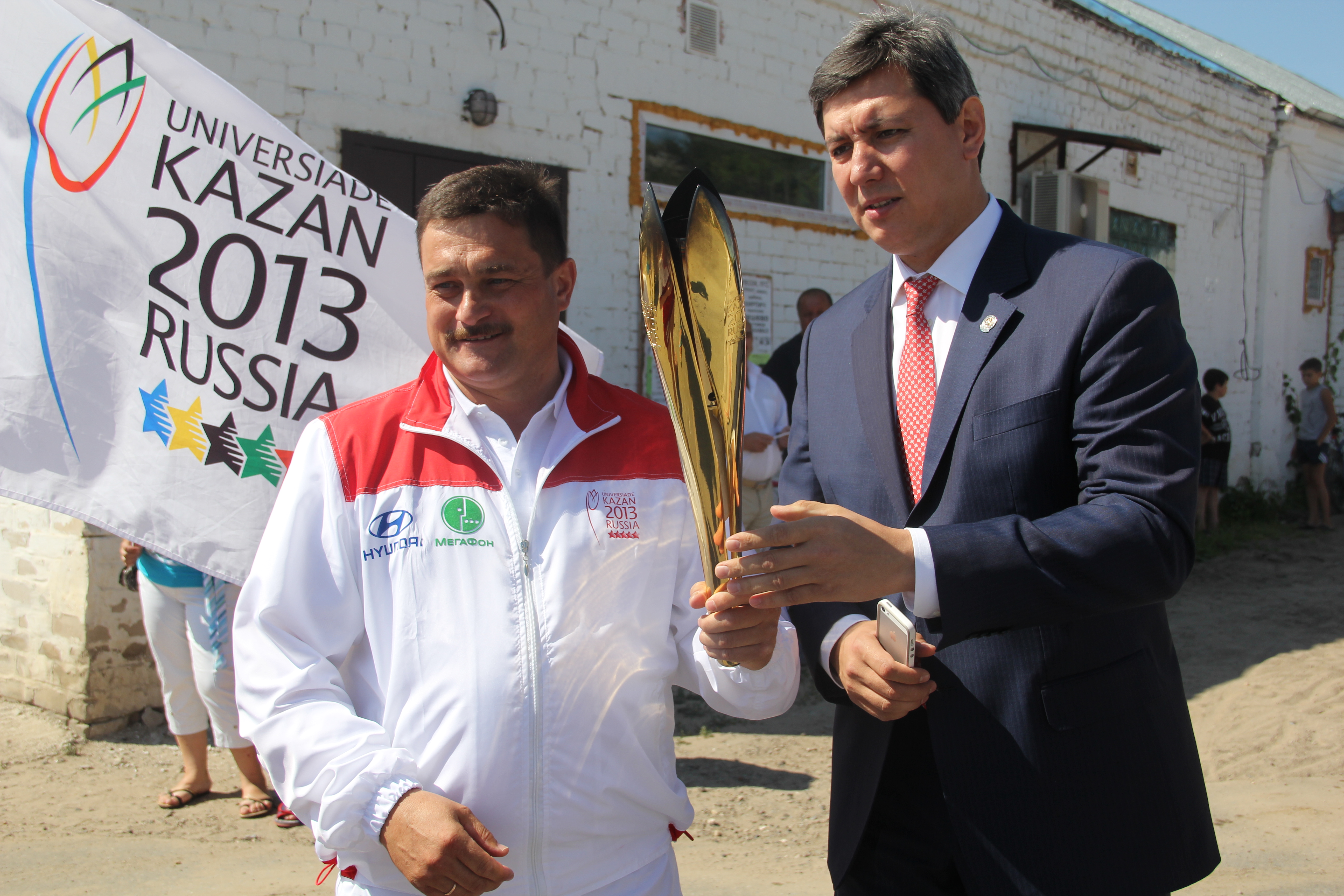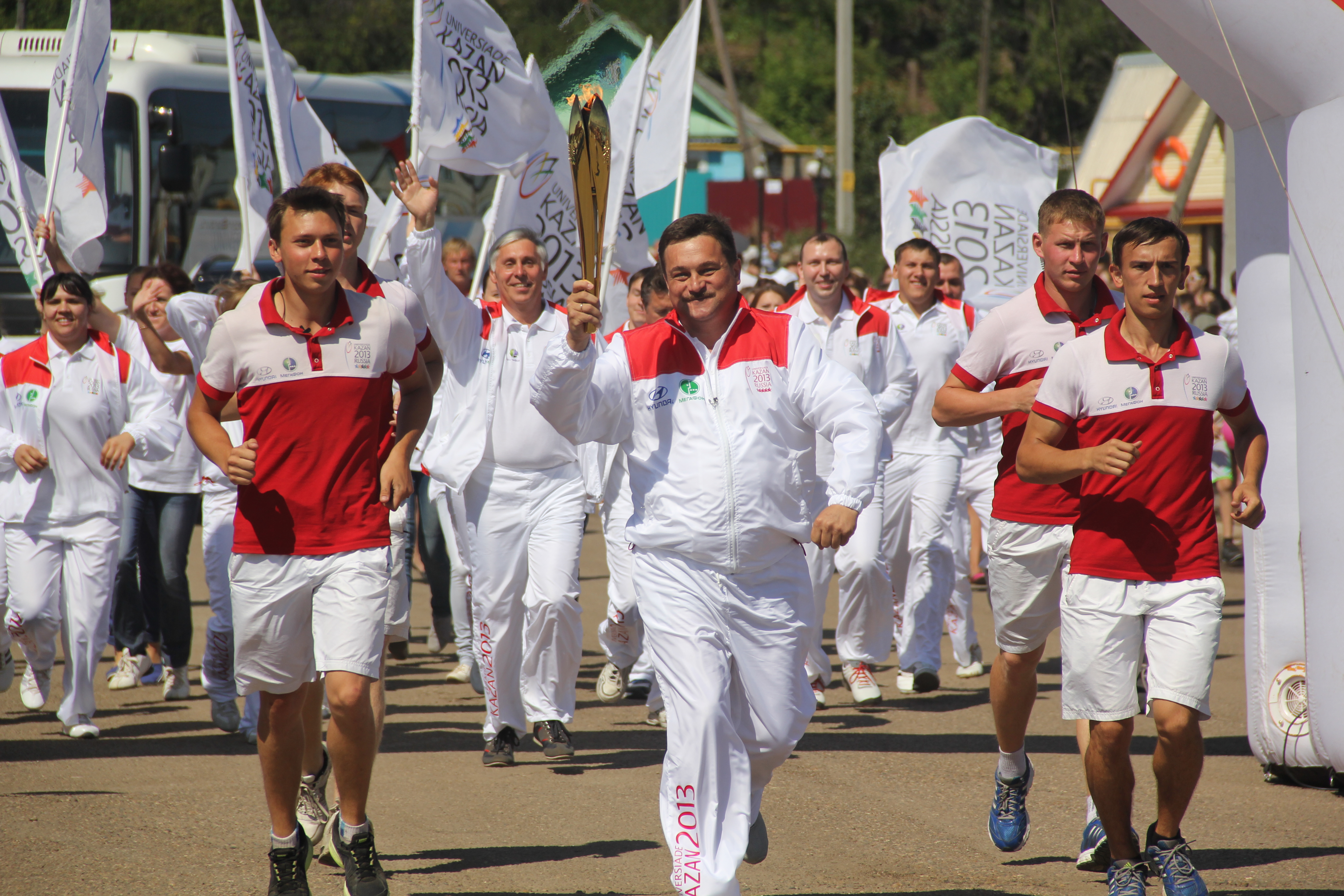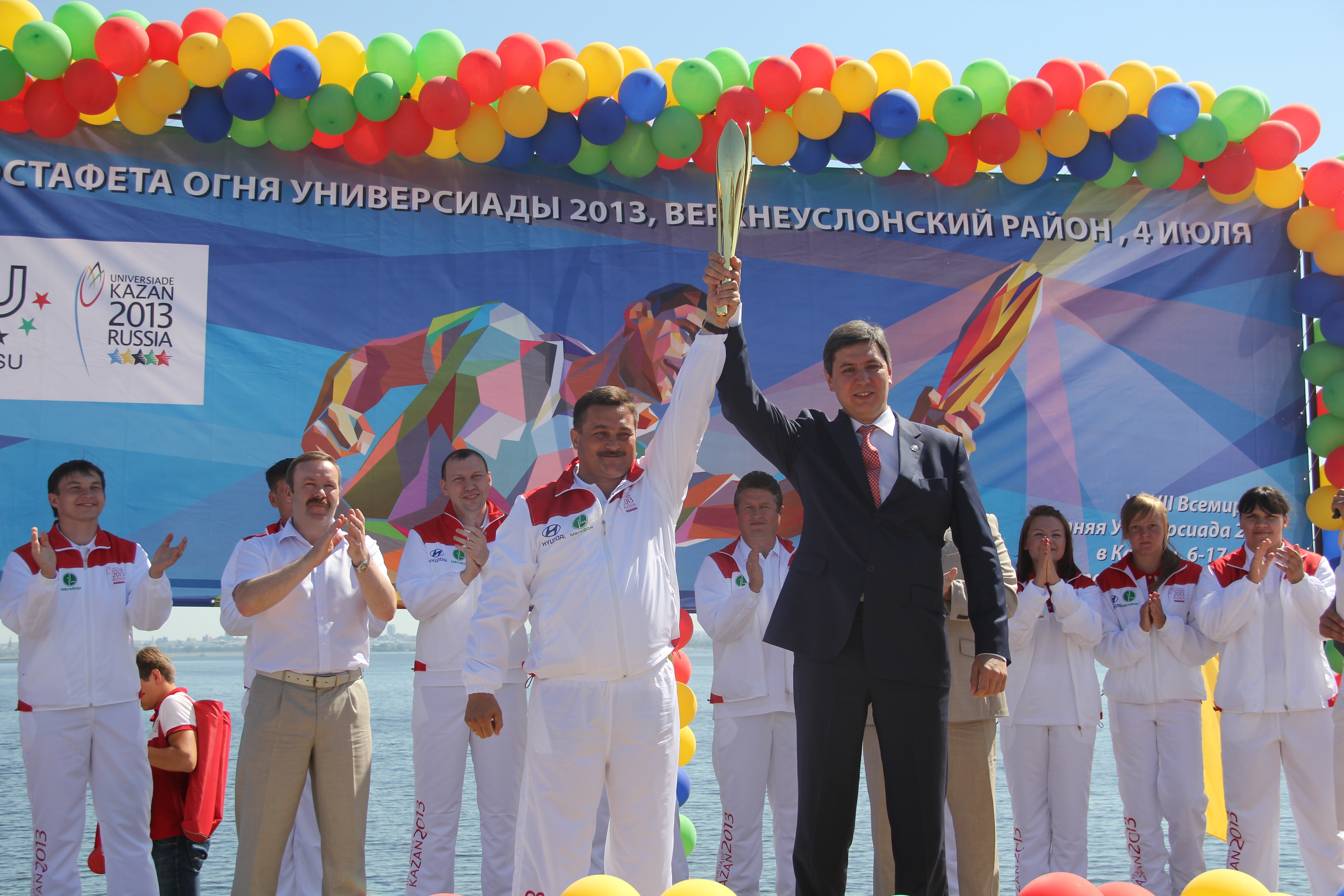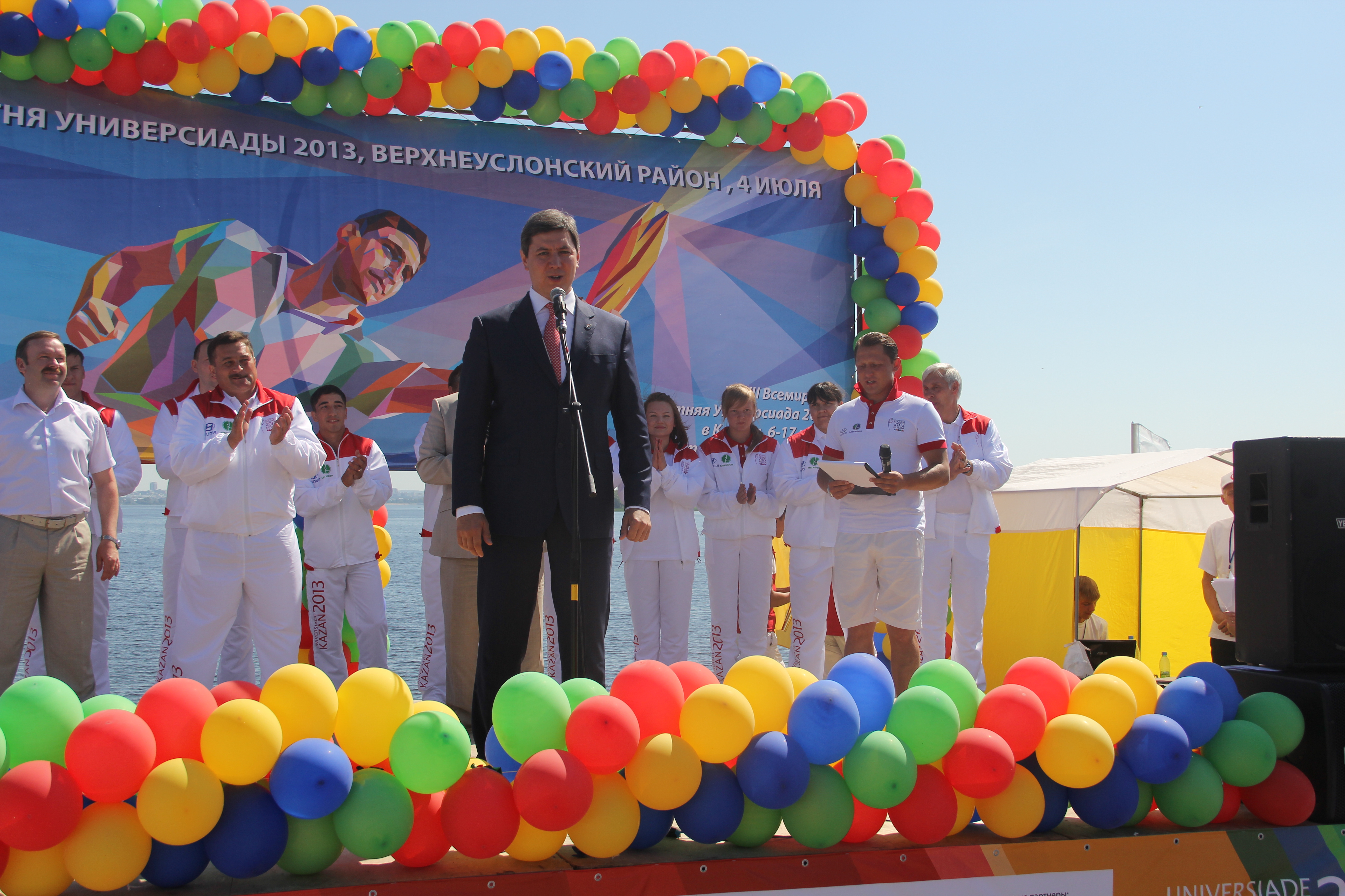 «Добрый день, верхнеуслонцы! Я рад быть на этом празднике спорта, молодости и студенчества! Это предпоследняя эстафета Огня, и буквально послезавтра он окажется в Чаше стадиона, на котором будет дан старт Универсиаде. 160 000 километров, 51 город мира, 2013 факелоносцев, - приветствовал Роман Шайхутдинов. - Я хочу пожелать вам отличного настроения, присоединяйтесь ко всем мероприятиям, которые пройдут в эти 12 незабываемых для Казани дней. И хочу поздравить главу за отлично проведенный праздник!».