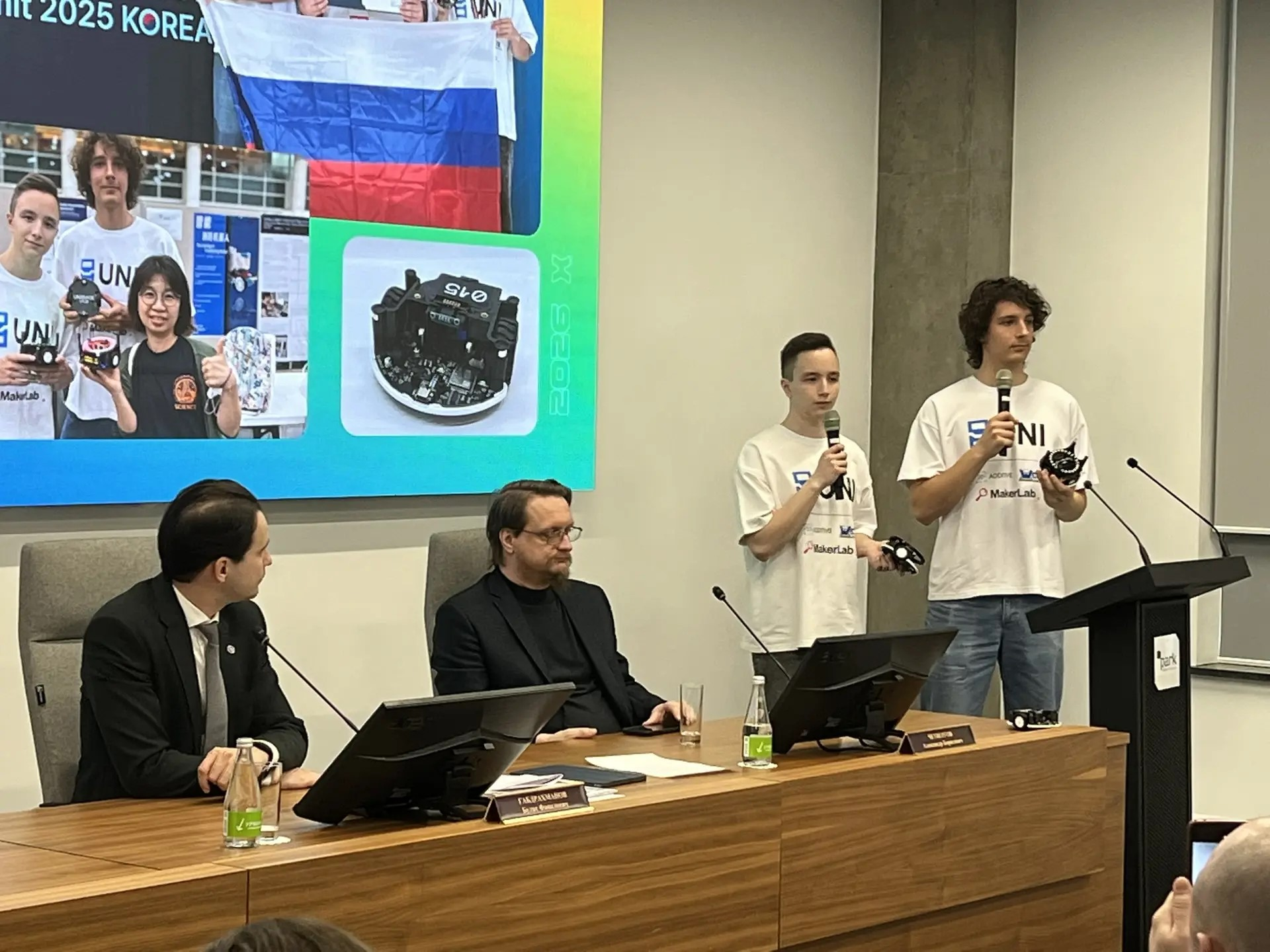 Школьники стали призерами международной олимпиады FIRA в Южной Корее (страна №1 по плотности роботизации) со своим стартапом Unibase. Это образовательная платформа, которая помогает ребятам учиться робототехнике и плавно переходить со сбора детских конструкторов до Arduino (электронная плата, где можно делать сложные проекты, например, собирать сервисных роботов).