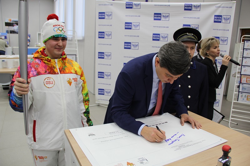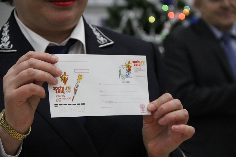 На посвященной Эстафете почтовой марке изображена эмблема Эстафеты Олимпийского огня. На полях почтового блока — карта Российской Федерации; факел Эстафеты, образы Московского Кремля и Морского вокзала в г. Сочи. Всего поступили 8 почтовых блоков, 50 почтовых марок, 2 конверта с оригинальной маркой, а также более 50 художественных маркированных конвертов и карточек.