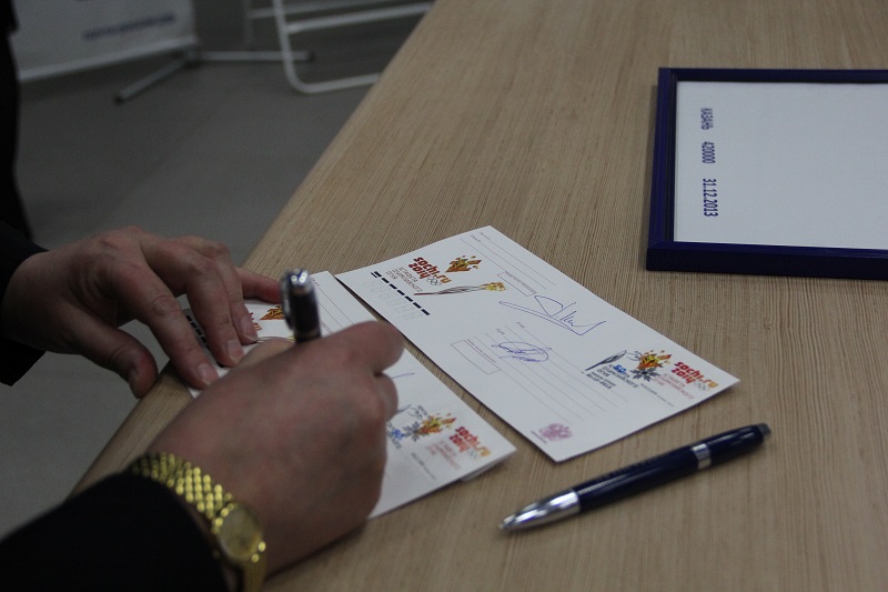 Во время торжественной церемонии все желающие смогли написать свои пожелания и напутствия сборной России на Олимпийских играх 2014 на открытке, которая будет отправлена в г. Сочи.