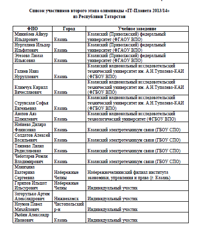 Республика Татарстан в первом этапе соревнований была представлена 184 студентами и молодыми дипломированными специалистами. 16 участников показали лучшие результаты, и теперь им предстоит защищать честь своего региона во втором отборочном этапе, который пройдет в дистанционной форме в марте 2014 года. Из них 12 участников ВУЗов, четыре - ССУЗов, и все они - студенты Казанского электротехникума связи. Поздравляем Набиеву Диляру, Солдатова Алексея, Тамиеву Лиану, Чеботарева Романа.
