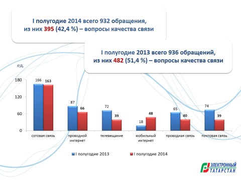 В Министерстве информатизации и связи РТ подвели итоги первого полугодия по качеству предоставляемых услуг связи на территории Республики Татарстан. По сравнению с аналогичным периодом 2013 года количество жалоб на качество услуг связи сократилось в 1,2 раза. Лидируют претензии на услуги сотовой связи. В 2014 году, в сравнении с прошлым годом, почти в 3 раза увеличилось количество жалоб на услуги мобильного интернета. Граждан по-прежнему волнуют вопросы отсутствия доступа к услугам сотовой связи и мобильного интернета в ряде сельских населенных пунктах Республики Татарстан.