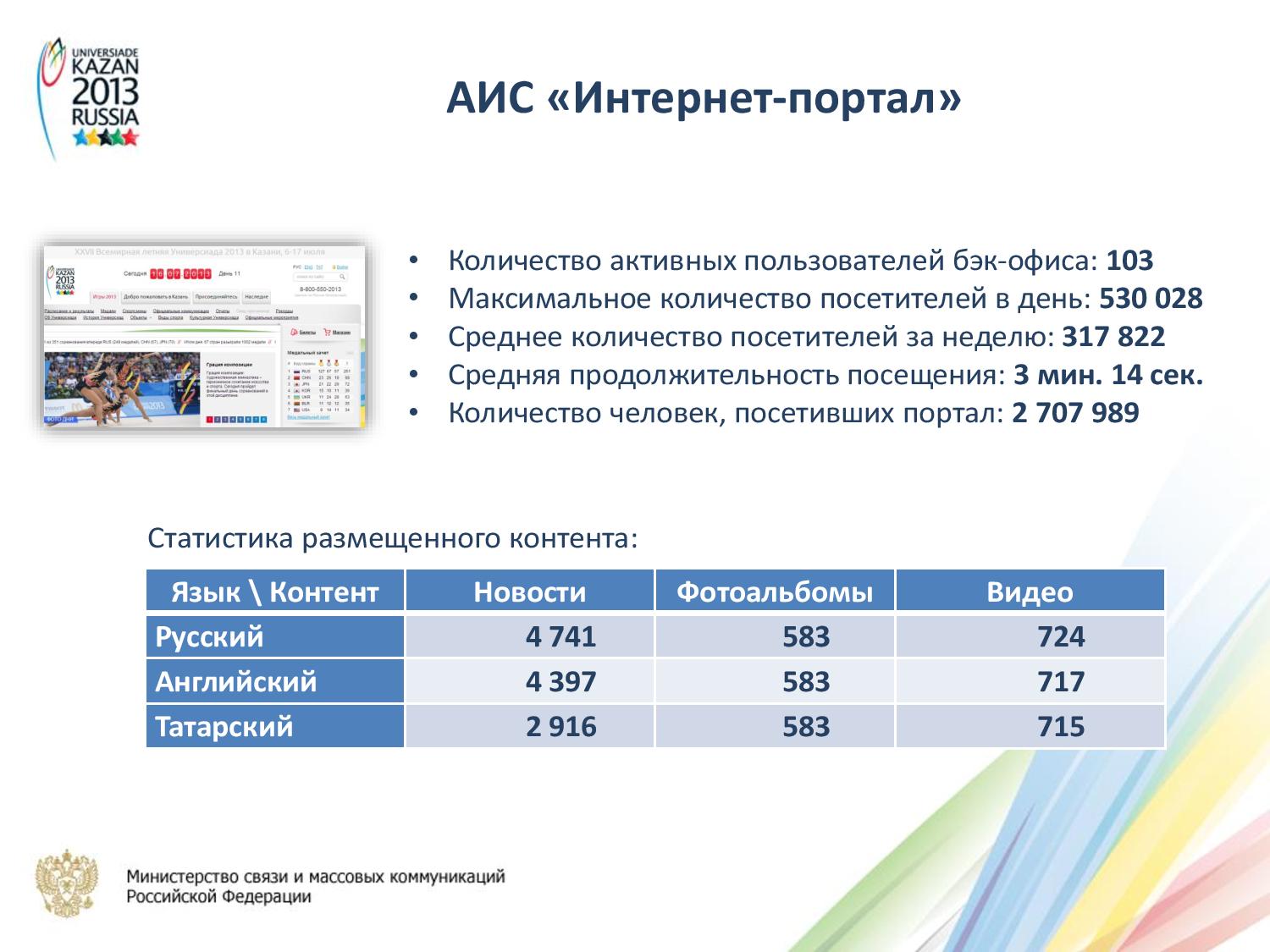 12 көн эчендә Универсиада Порталына 2,7 млн кеше кергән. Һәркөнне сайттны 530 мең кулланучы караган.