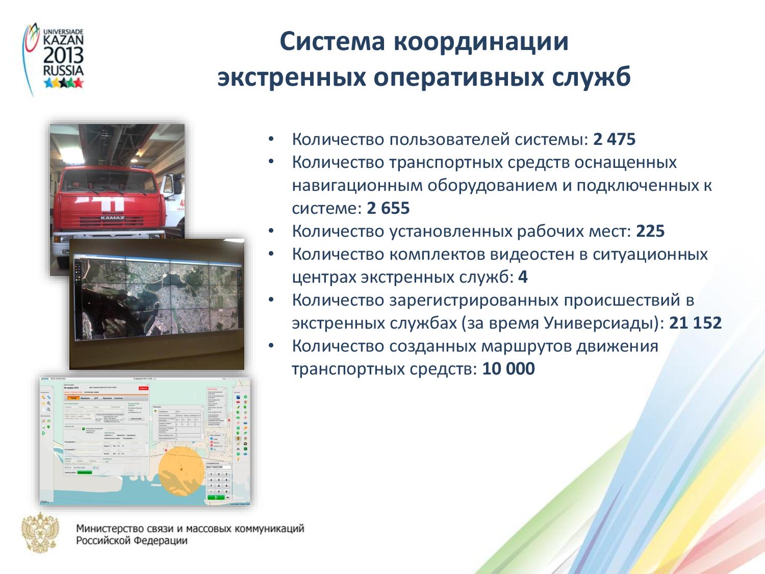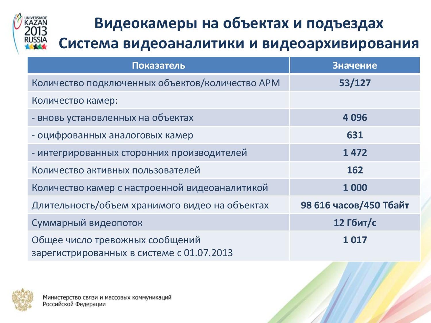 Универсиаданың 53 объектында көнәйләнеш видеоаналитик һәм видеархивлау эшләгән. Барлыгы виедокүзәтү системасы эше өчен Универсиаданың 58 объектында 6 411 камера куелган.