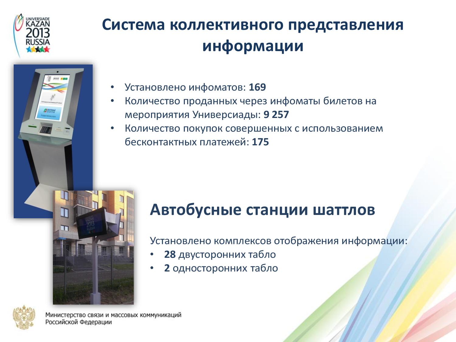 Уеннар тарихында беренче тапкыр инфоматлар аша билетларны броньлаштыру һәм сатып алу мөмкинлеге кертелгән. Инфоматлар аша уеннар тәртибен, медаль зачет һәм башка мәгълүмати сервислар белеп була иде. Шәһәр буенча урнаштырылган 169 инфомат аша 9 меңнән артык билет сатылган.