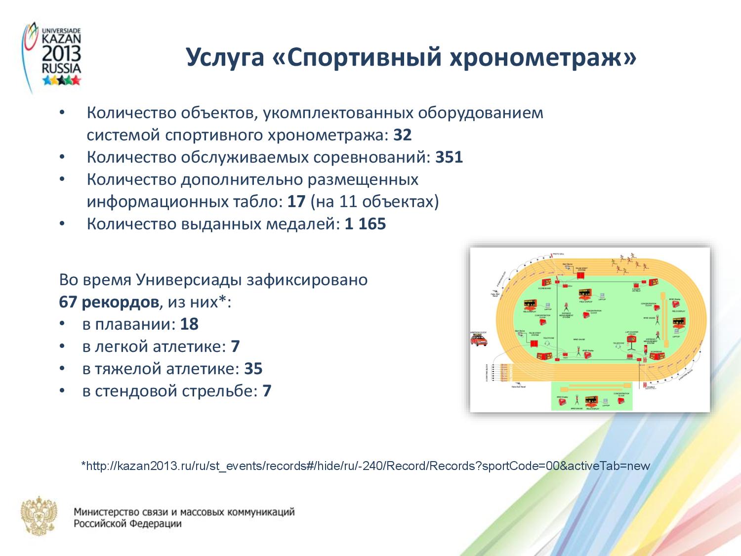 Интернетка керү мөмкинлеген булдыру өчен 186 км волокно линиясе сузылган була һәм 1 550 км арендаланган линия кулланыла. Интернетка тоташкан 61 Универсиада объектында көненә кулланыла торган трафик күләме 14,42 Тбайт җиткән.