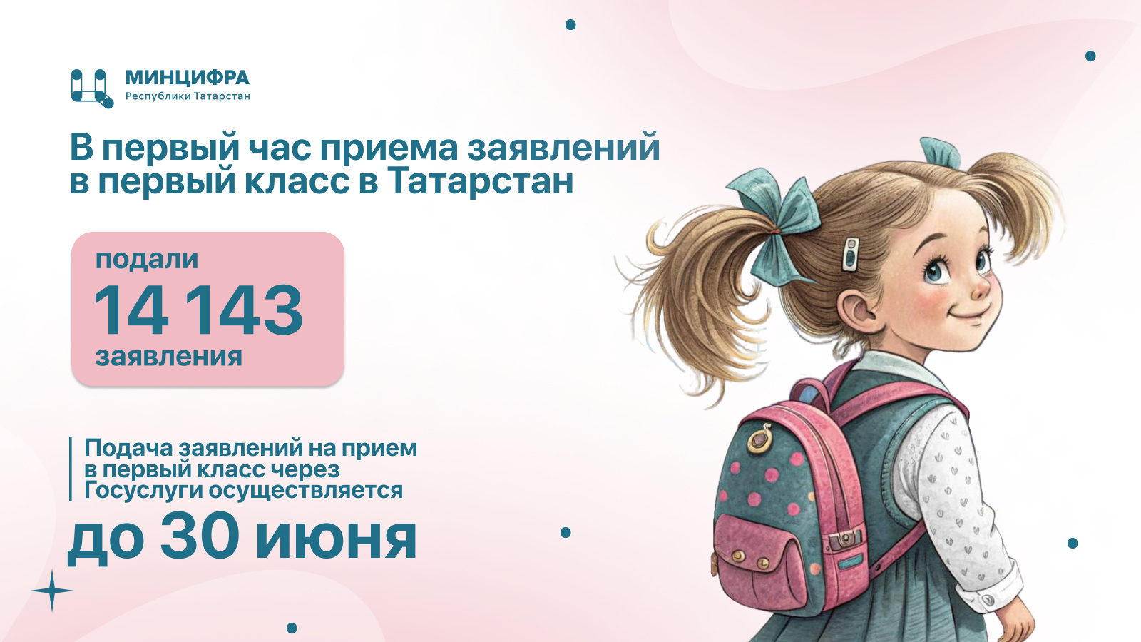 Дәүләт хезмәтләре порталы аша балаларны беренче сыйныфка яздыру бара: кампаниянең беренче сәгатьләрендә үк 14 меңнән артык гариза бирелгән. Кампания 1 апрельдә 8:00 сәгатьтә башланды, һәм бер сәгать эчендә Татарстанның ата-аналары 14 143 электрон гариза тапшырган. Тәүлек ахырына бу сан 21 475 кә кадәр арткан, ә 3 апрель 16:00 сәгатькә гаризаларның гомуми саны 24 меңнән артып киткән.