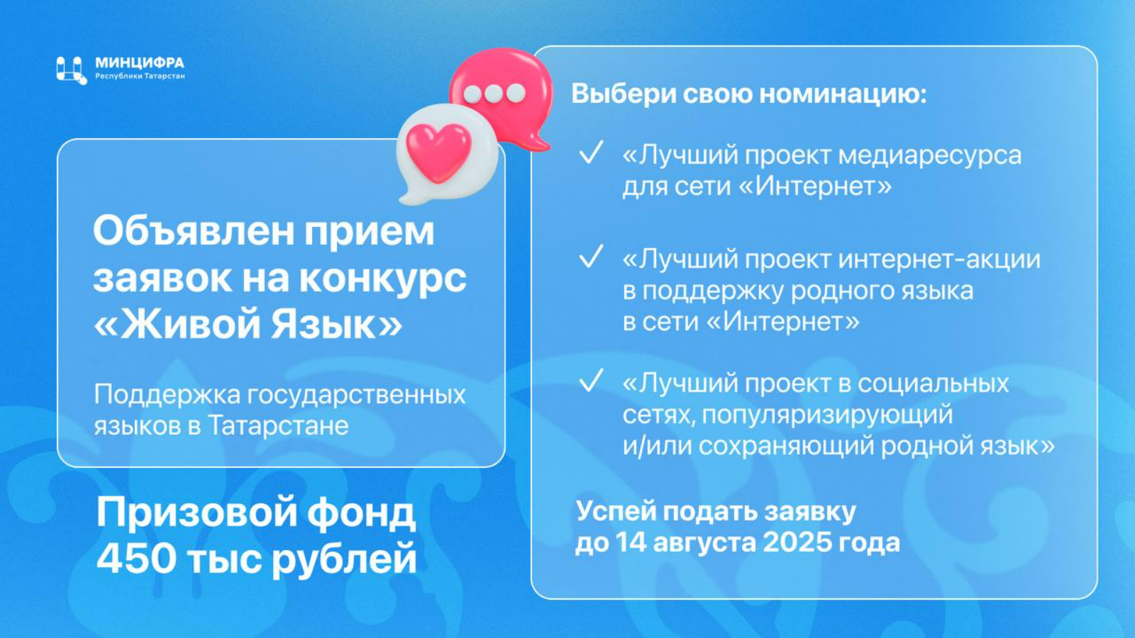 9 июньнән Татарстан Республикасы дәүләт телләре һәм төбәк халыкларының башка телләре үсеше һәм эшчәнлеге проблемаларын яктыртуга юнәлдерелгән республика медиапроектлар конкурсына гаризалар кабул итү игълан ителде.